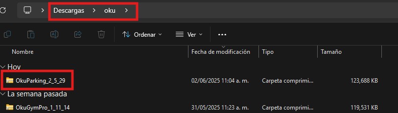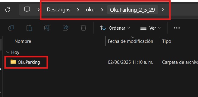 Descomprimir los archivos que se encuentran dentro del archivo .ZIP, de modo que se generara una capeta dentro llamada Okuparking.