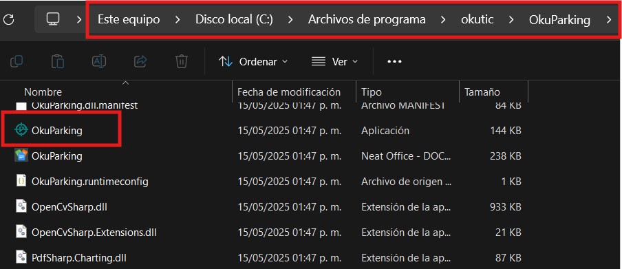 Dentro de la carpeta se encuentra un archivo llamado Okuparking y el logo del aplicativo, da doble clic izquierdo en el archivo para abrir la aplicación.