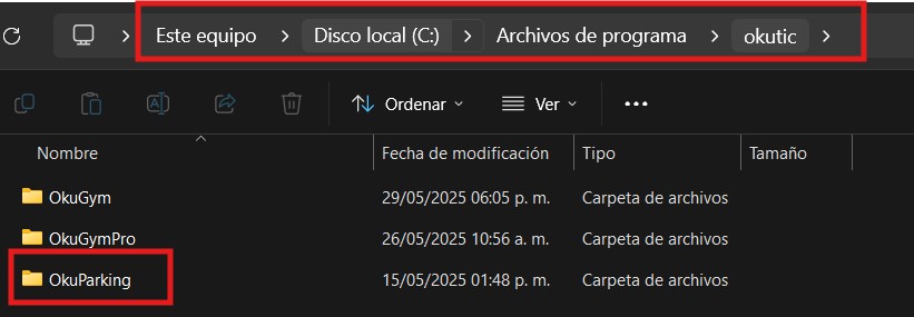 Copiar la carpeta completa Okuparking y pegarla en la ruta del disco local C:\Program Files\okutic