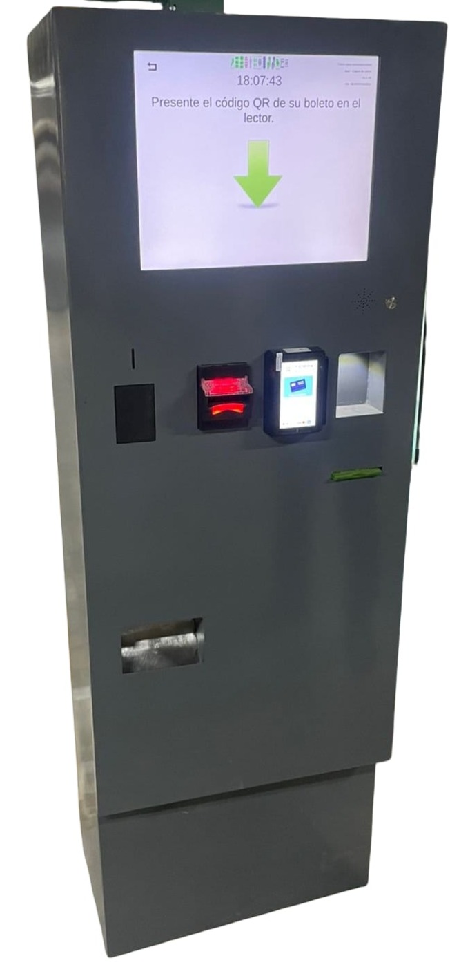 El cajero de cobro es una Terminal de Okuparking, la cual permite al usuario realizar el pago de su boleto según la tarifa asignada, los medios de pago pueden ser: