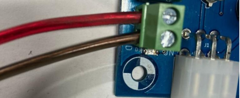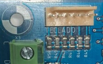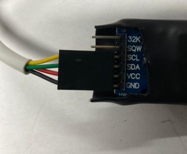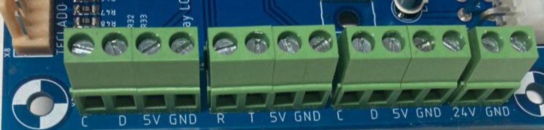 El siguiente par de borneras corresponden a la conexión del módulo de reloj. El cable negro se conectará en la bornera marcada con GND, el cable rojo en la bornera marcada con 5v, el cable verde con la bornera marcada con D y el cable amarillo en la bornera marcada con la letra C.