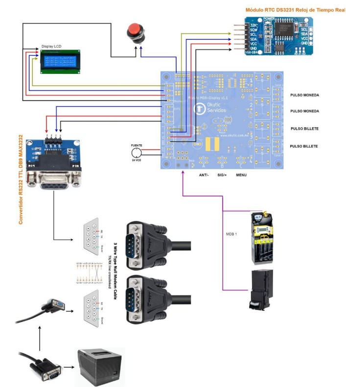 Por otra parte, en la esquina inferior izquierda del MDB Display v1.1 se podrá encontrar el conector tipo molex de 6 pines el cual corresponde a la conexión del monedero al conectar el monedero automáticamente empezará la comunicación del MDB Display v1.1 con el monedero esta estará establecida cuando el indicador luminoso ubicado en la parte derecha del conector empiece a parpadear.
