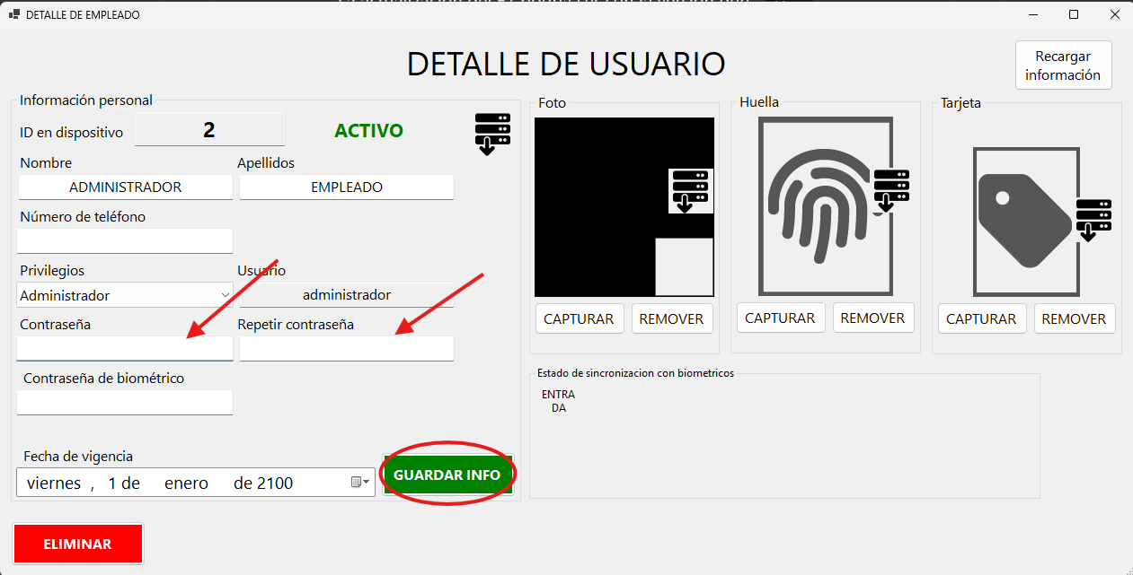 Escribe la nueva contraseña y repítela en los campos marcados y da clic en “GUARDAR” para que se apliquen los cambios.