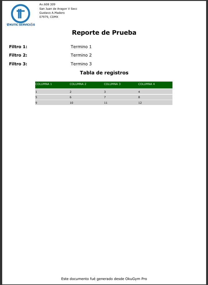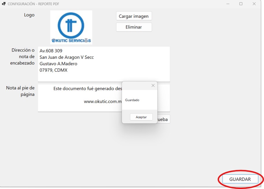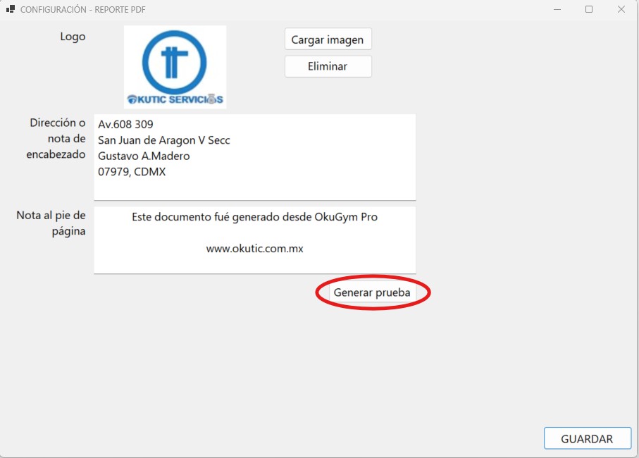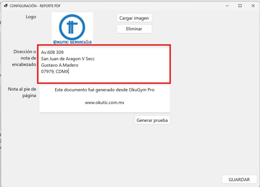 5.Edita la dirección de tu gimnasio en el campo DIRECCION O NOTA DE ENCABEZADO que mostrara en el reporte.