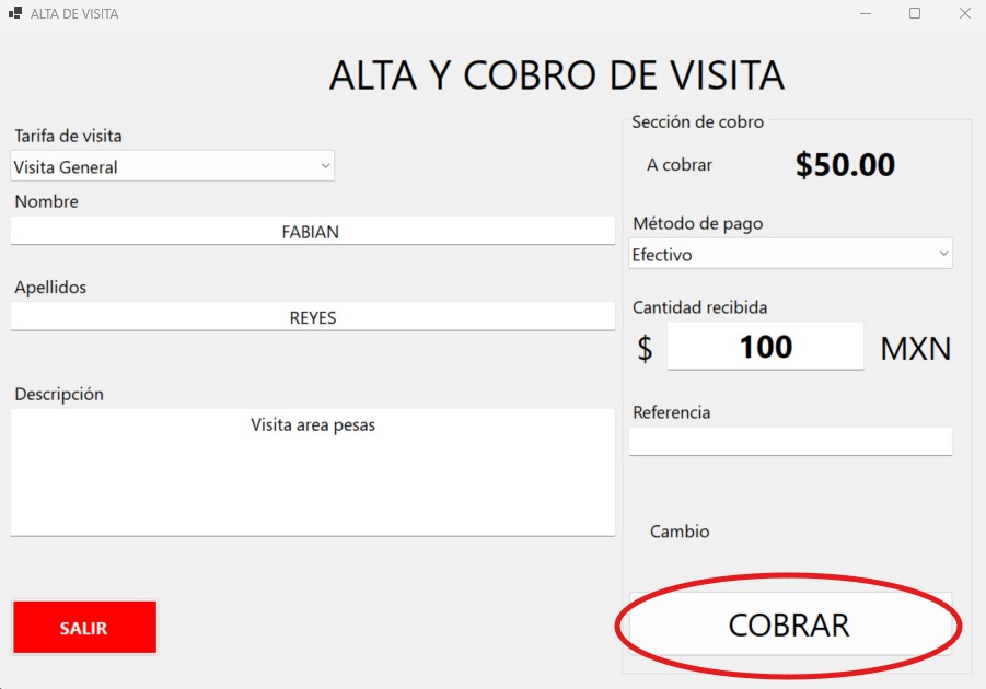 Una vez llenado los campos da clic en el botón "COBRAR" y te genera el cambio que debas dar si se requiere.