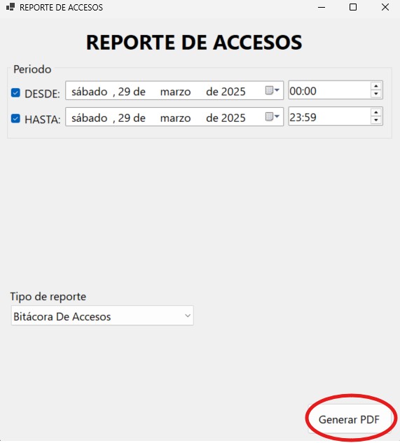 2. Selecciona el periodo de tiempo del que deseas consultar los accesos por fecha y hora, o deshabilita las casillas para obtener un histórico desde que se iniciaron operaciones y da clic en “GENERAR PDF”.
