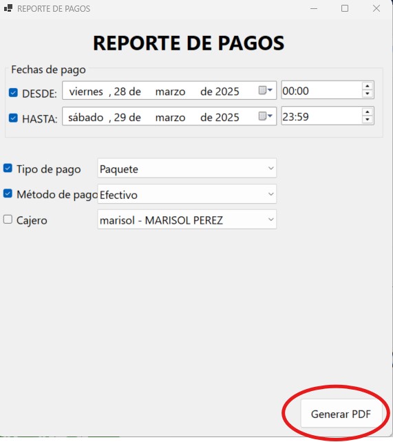 2. Selecciona la fecha y hora, así como el método de pago y el empleado si lo deseas, del reporte en PDF y da clic en "GENERAR PDF".