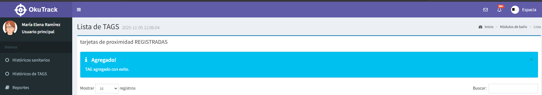 Da clic en "AGREGAR" y te redirige a la pantalla de TAGS con un mensaje de guardado correctamente.