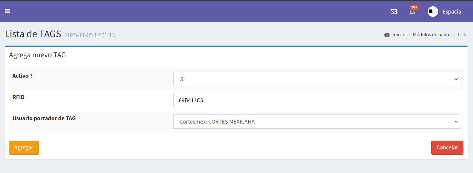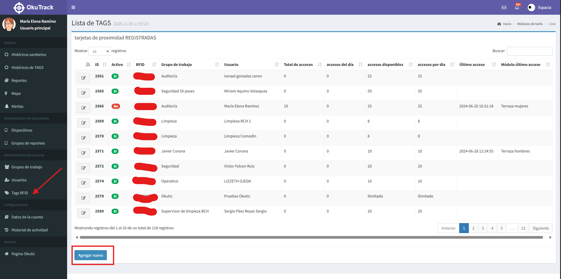 Para agregar una tarjeta a un usuario da clic en el menú TAGS RFID y en la parte inferior izquierda da clic en el botón AGREGAR NUEVO.